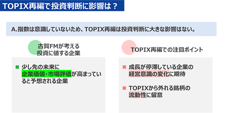 前半のパートでは東証改革、特にTOPIX再編の話がありましたが、実際の投資判断にどのような影響がありますか。