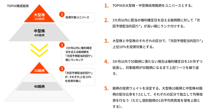 - 3か月以内に配当の権利確定日を迎える銘柄の中から、大型株で次回予想配当利回り*の高い銘柄を中心に集中投資することで高い配当収益を確保することを目指します。