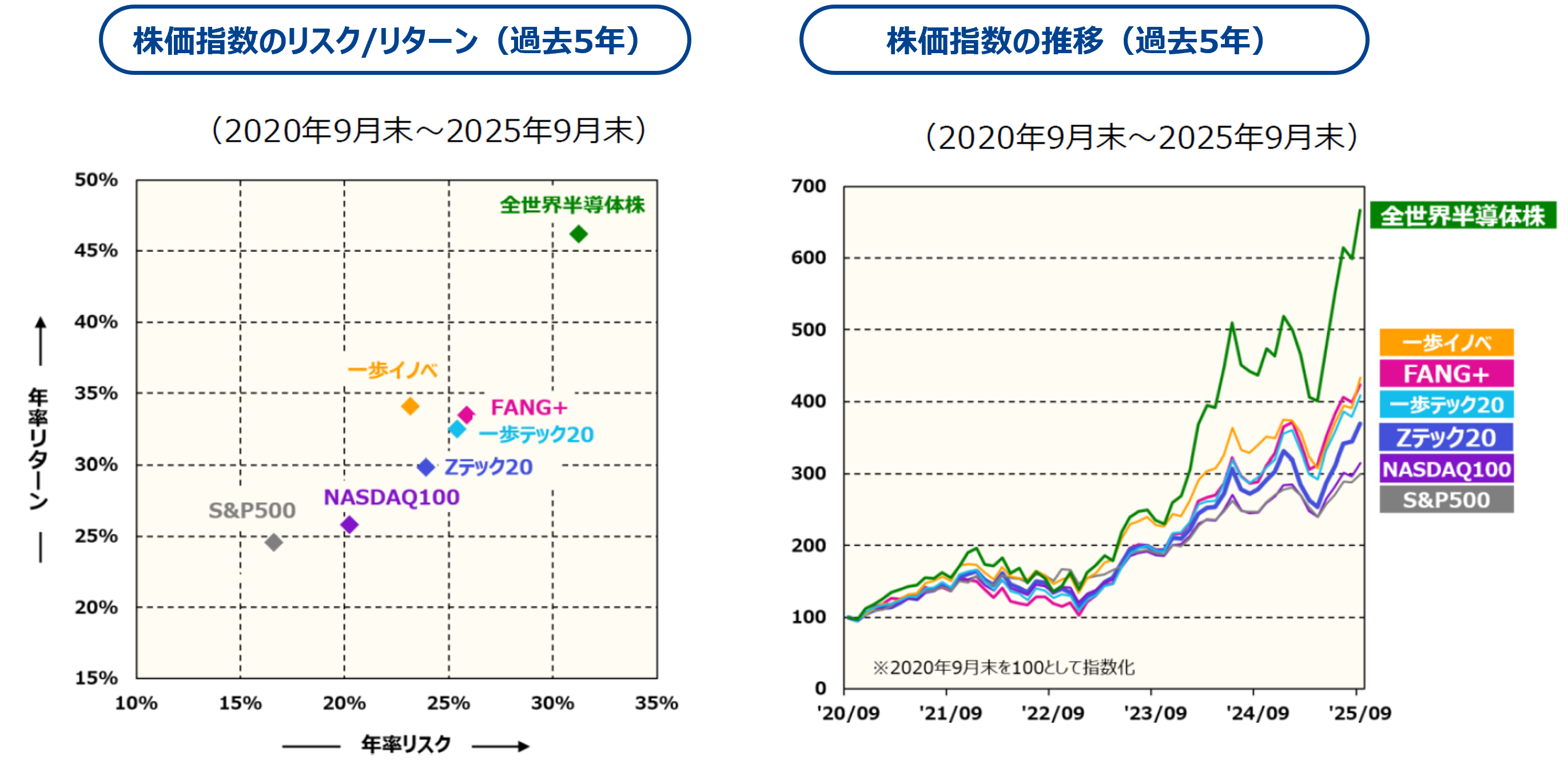 | 「指数について」 | 「半導体」、「AI/ビッグデータ」、「ヘルスケア/バイオテクノロジー」、「次世代モビリティ/バッテリー/再生可能エネルギー」に着目。均等加重で構成しているため、各銘柄の比率は6.6%。 | テクノロジー関連企業を抽出した後、国・地域(2025年9月現在は中国、ロシア)に起因するリスクが高いと考えられる銘柄を除外し、時価総額上位20銘柄に投資。 | 半導体関連とされる企業のうち、市場シェア・収益性・成長性等の基準を用いて銘柄を選定。リバランス時における1銘柄の上限比率は35%。銘柄数に制限はありません。 |
