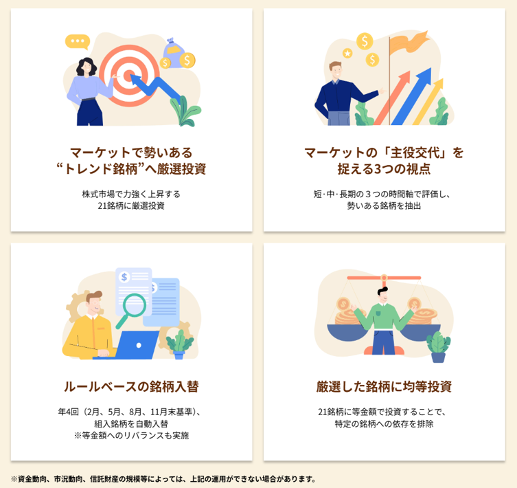 株価の勢いや方向性を示す「モメンタム」に着目し、銘柄を厳選することでマーケットの「主役交代」を捉えることを目指します。