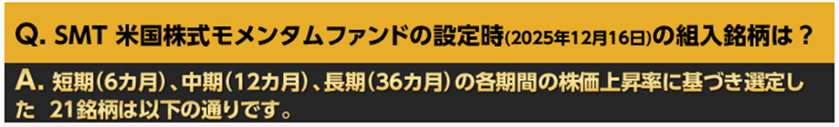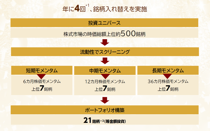 - 当ファンドシリーズでは株価の勢いや方向性を示す「モメンタム」に着目し、原則として、短期・中期・長期の各期間の株価上昇率に基づき投資銘柄を決定します。