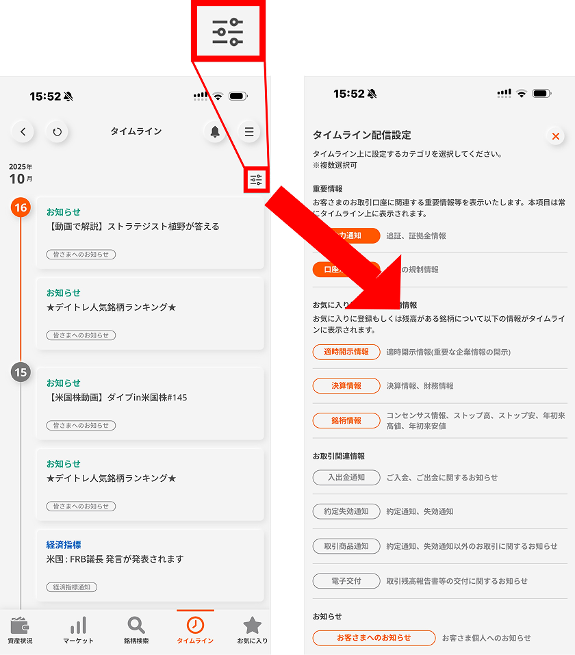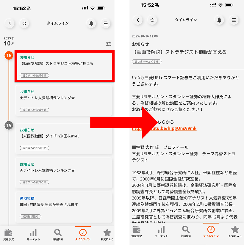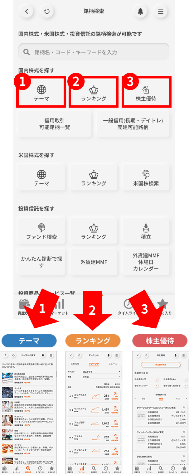 画面下部には、よく利用する画面へのリンクボタンが配置されています。株式の注文や投資情報は、画面最下部のメニューからの移動が便利です。
