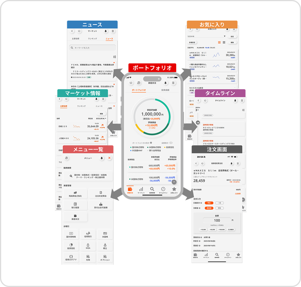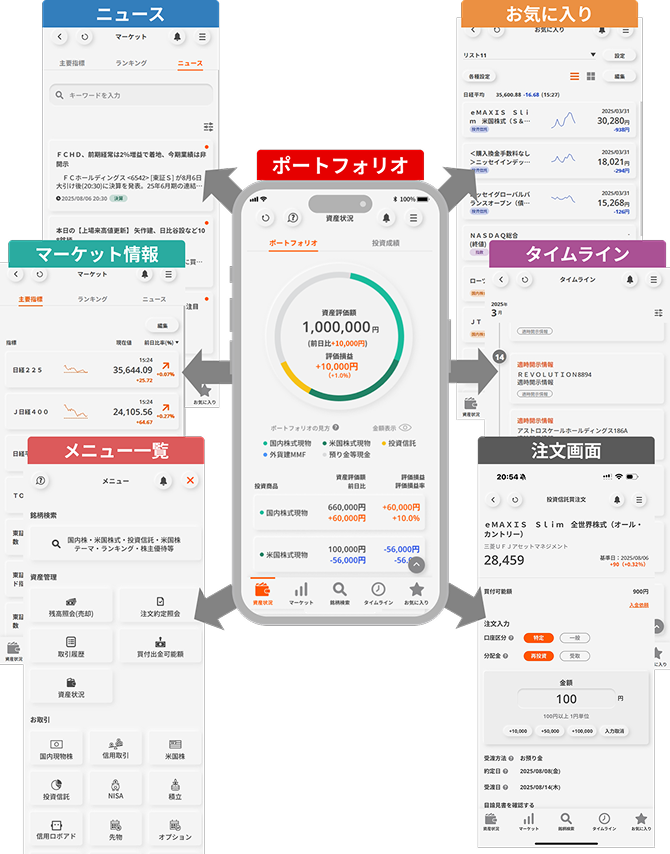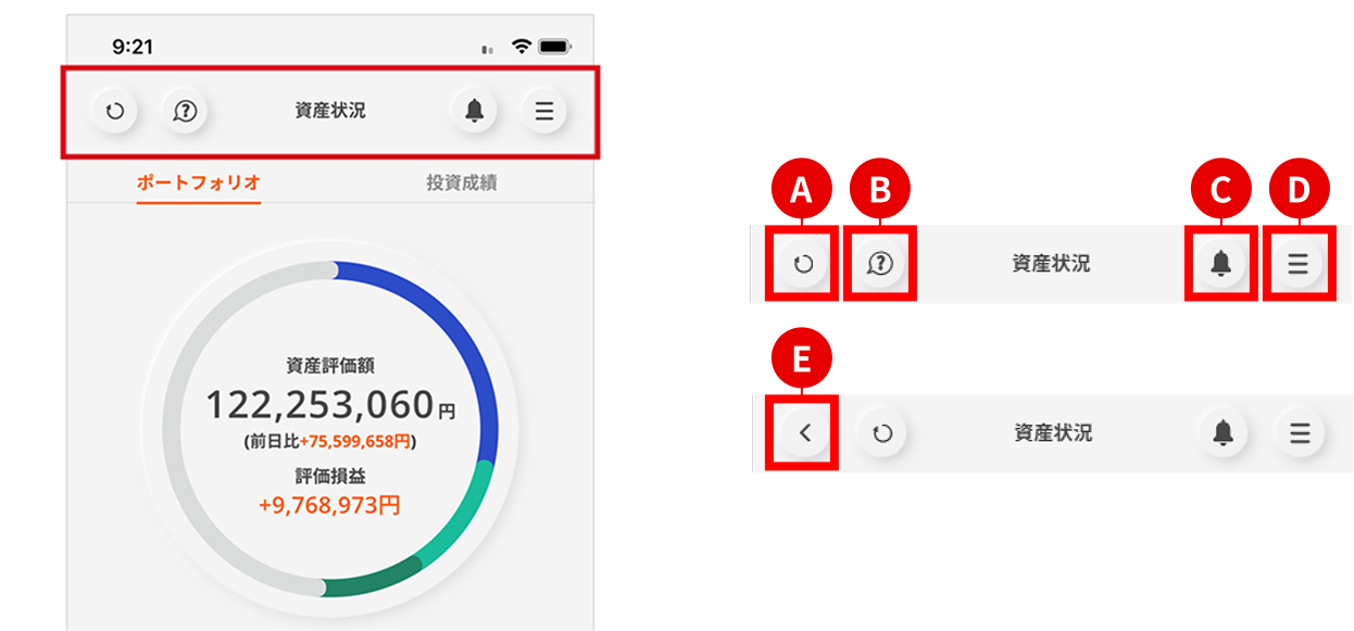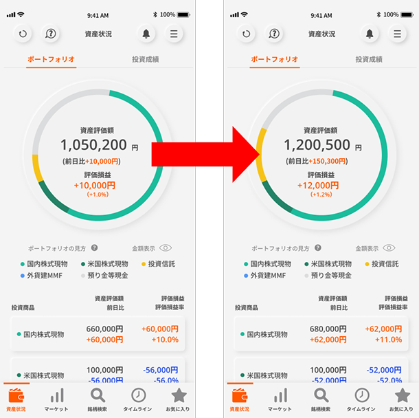 本アプリでは、ログイン後、すぐに資産状況を把握できるようにポートフォリオ画面が表示されます。
