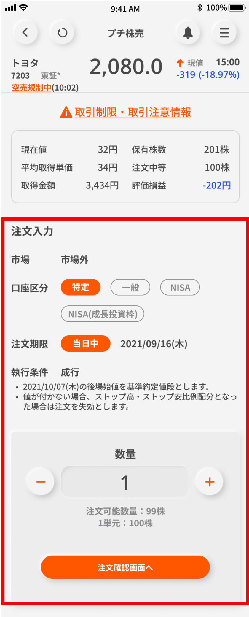 画面下部の「取引する」ボタンを押して「プチ株」をタップする。