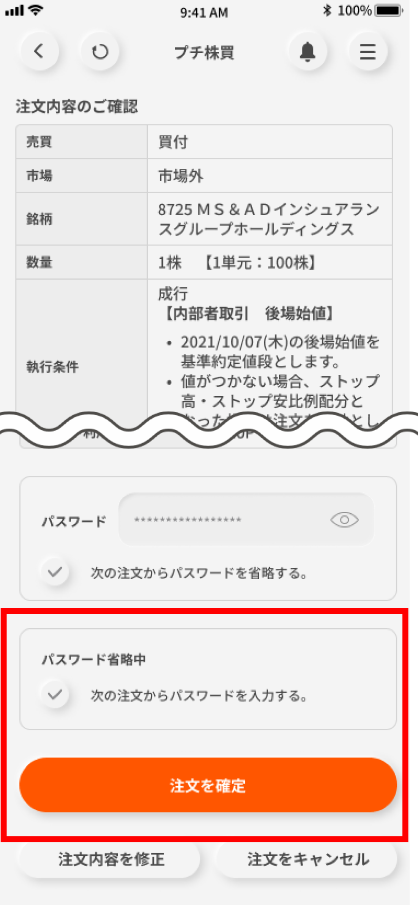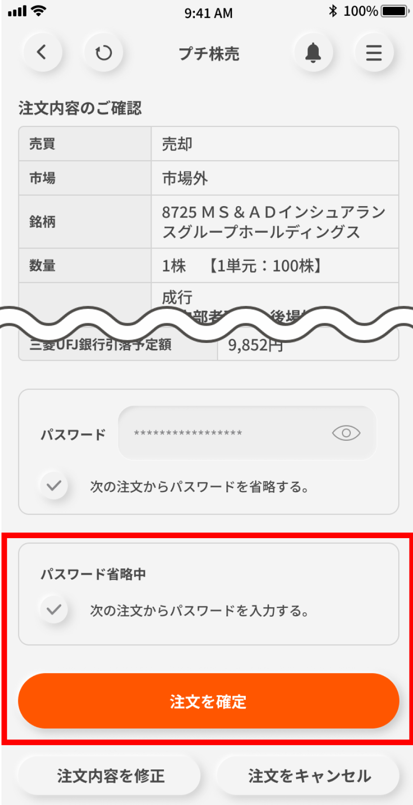 発注内容を確認のうえ、パスワードを入力し「注文を確定」をタップする。