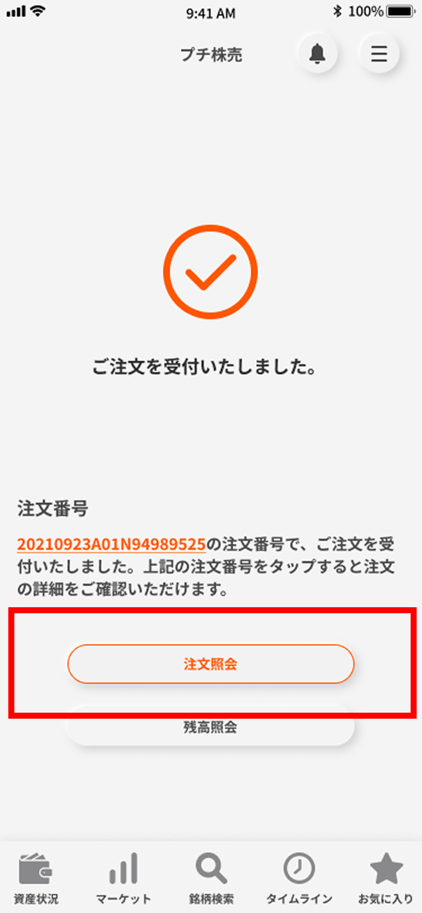 発注内容は「注文照会」ボタンからご確認いただけます。