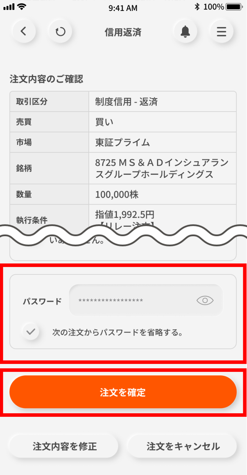 発注内容を確認のうえ、パスワードを入力し「注文を確定」ボタンをタップする。