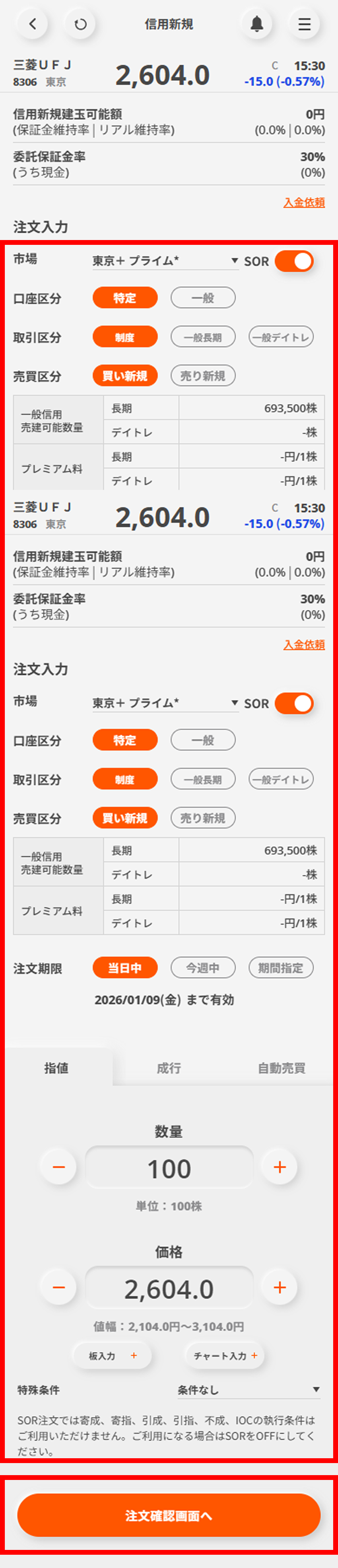 画面下部の「取引する」ボタンをタップして、「信用新規」ボタンを選択する。