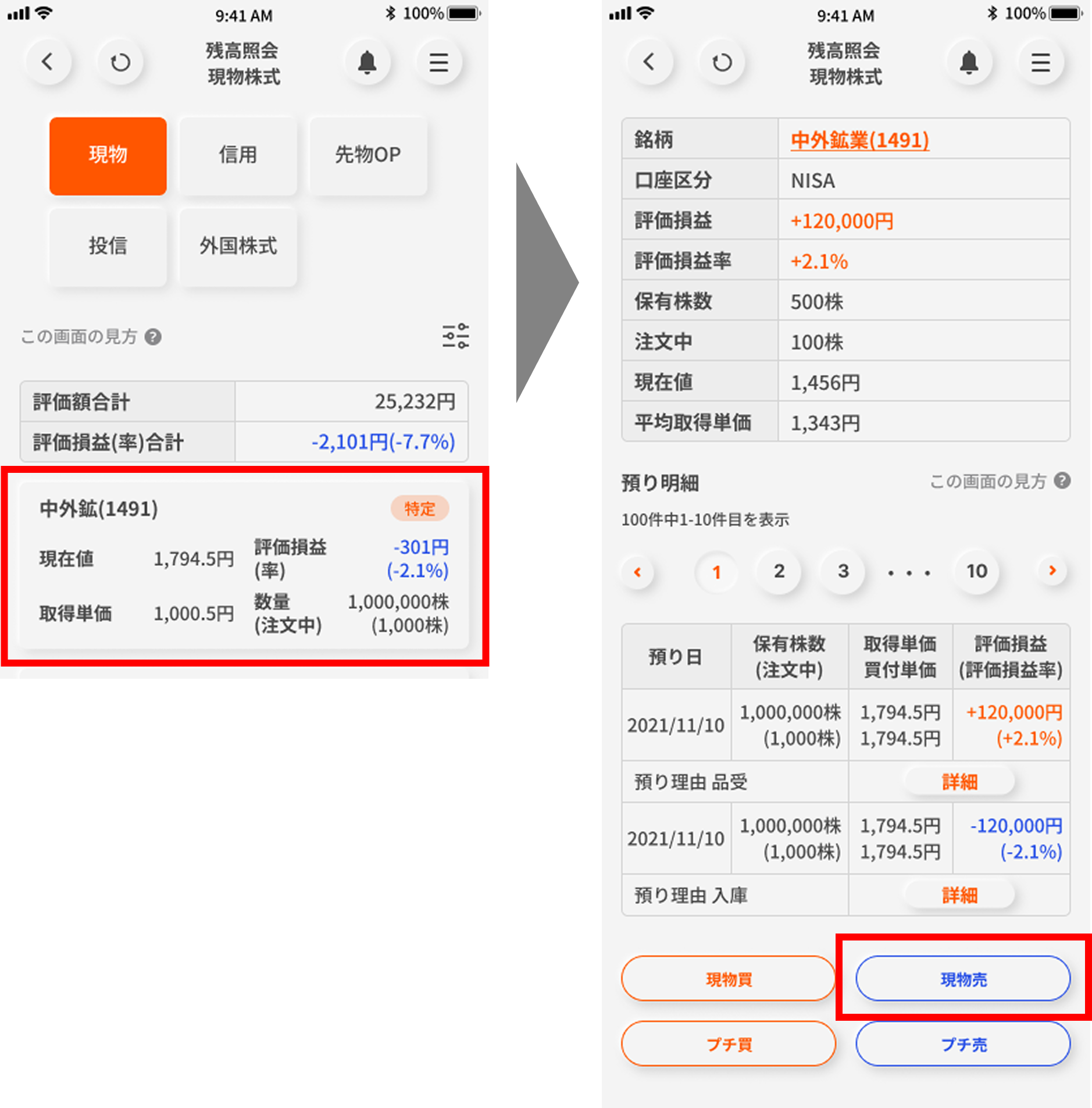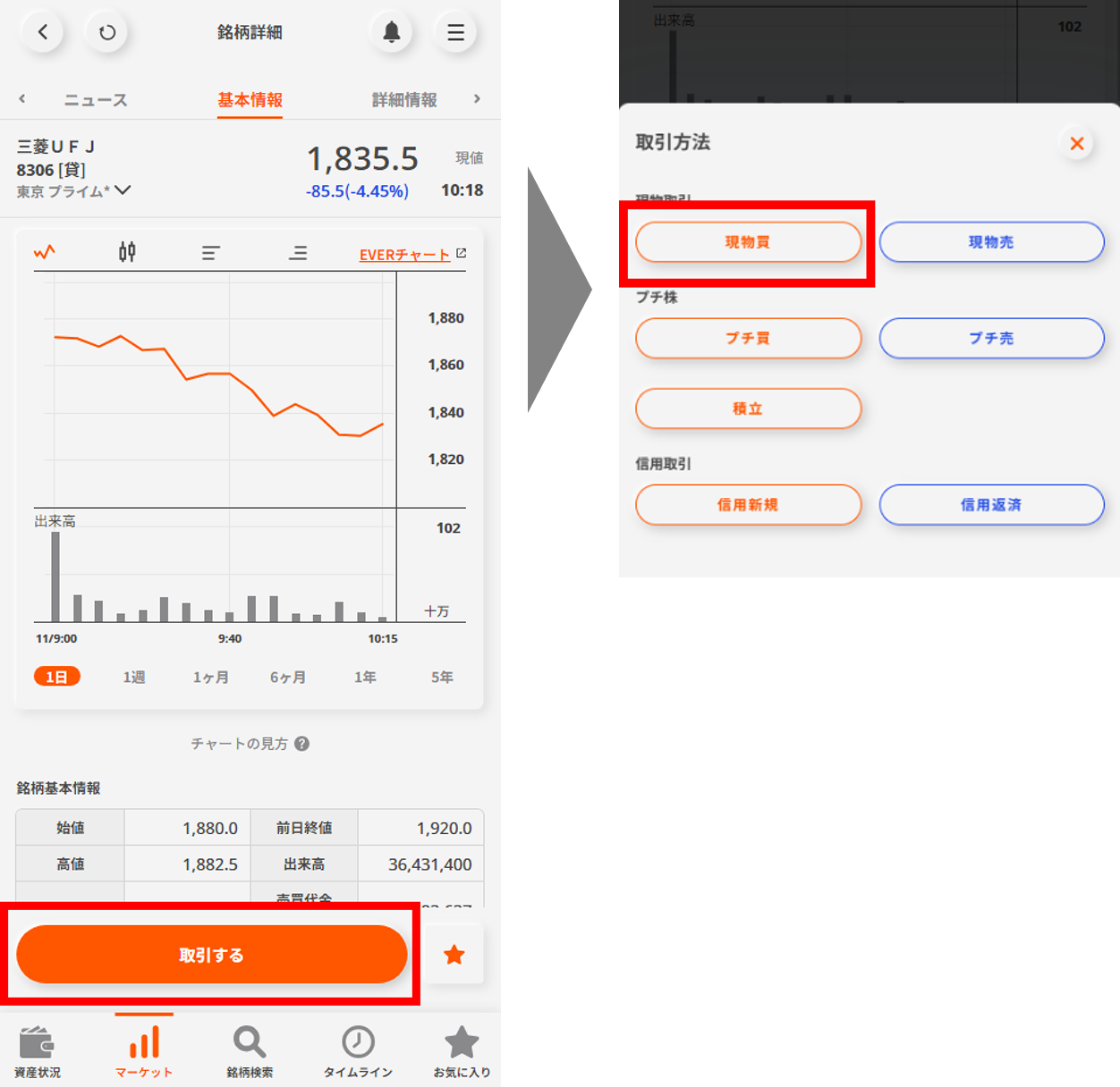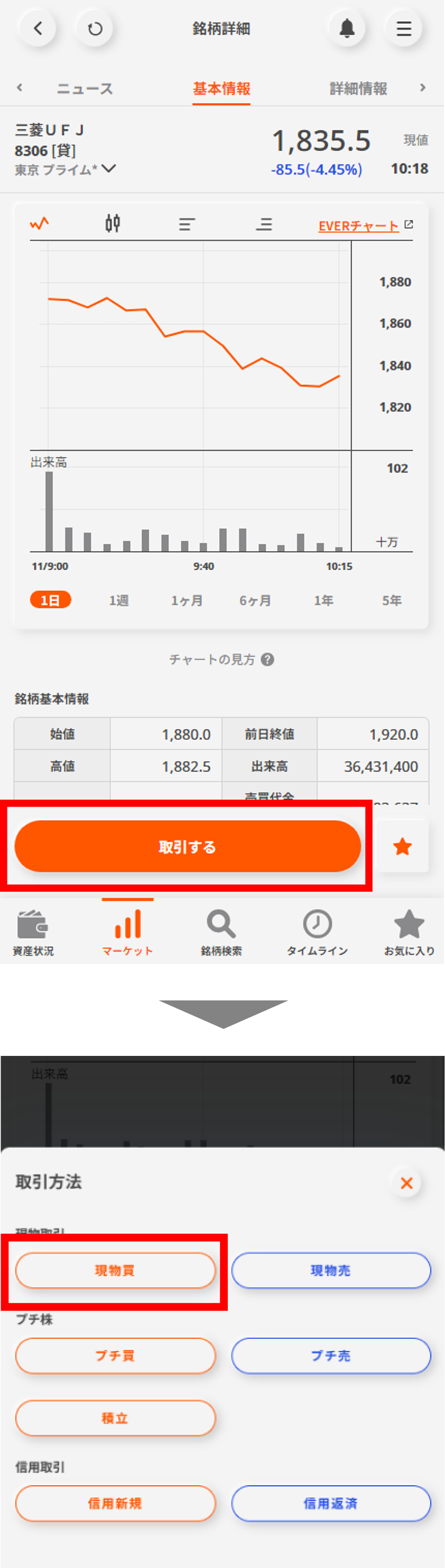 画面下部の「取引する」ボタンをタップして、「現物買」を選択する。