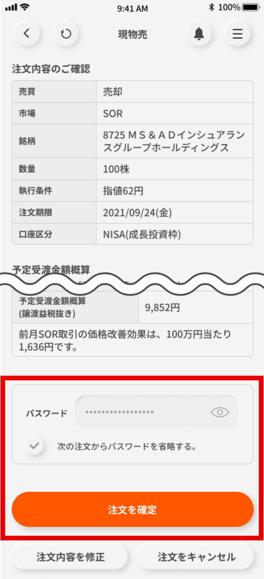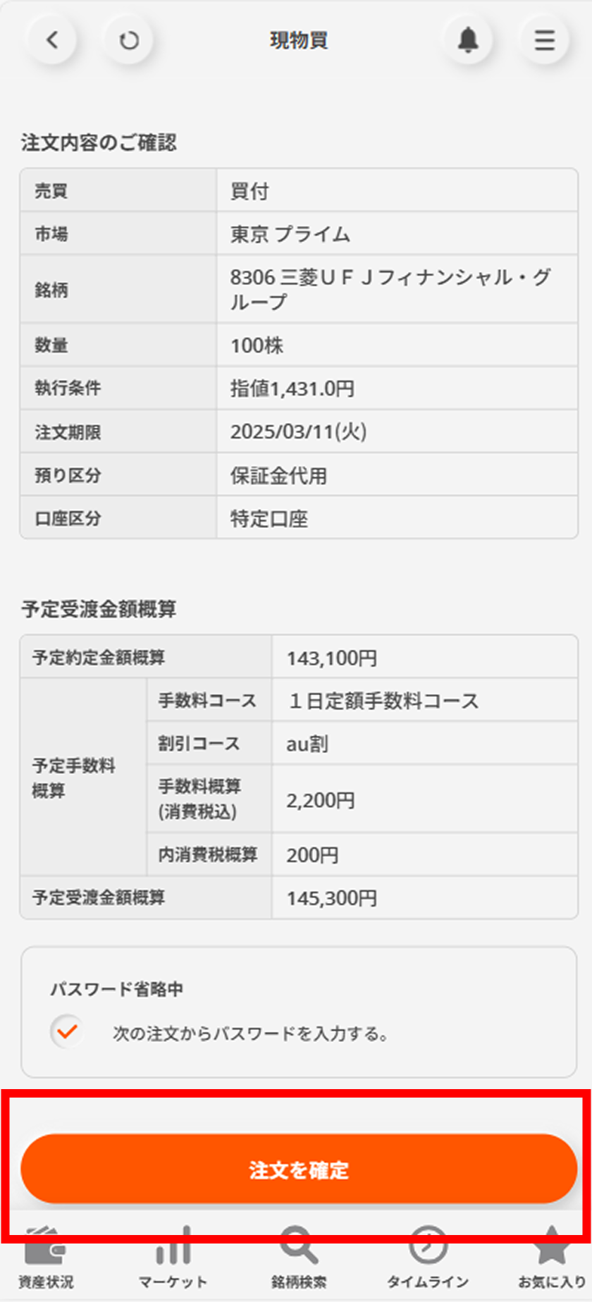 発注内容を確認のうえ、パスワードを入力し「注文を確定」を選択する。
