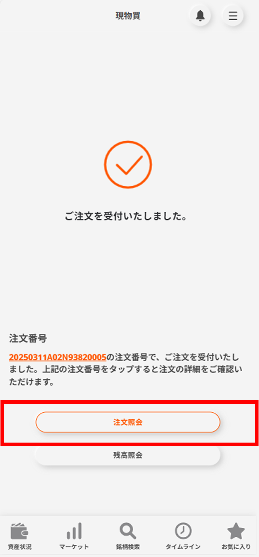 発注内容は「注文照会」ボタンからご確認いただけます。