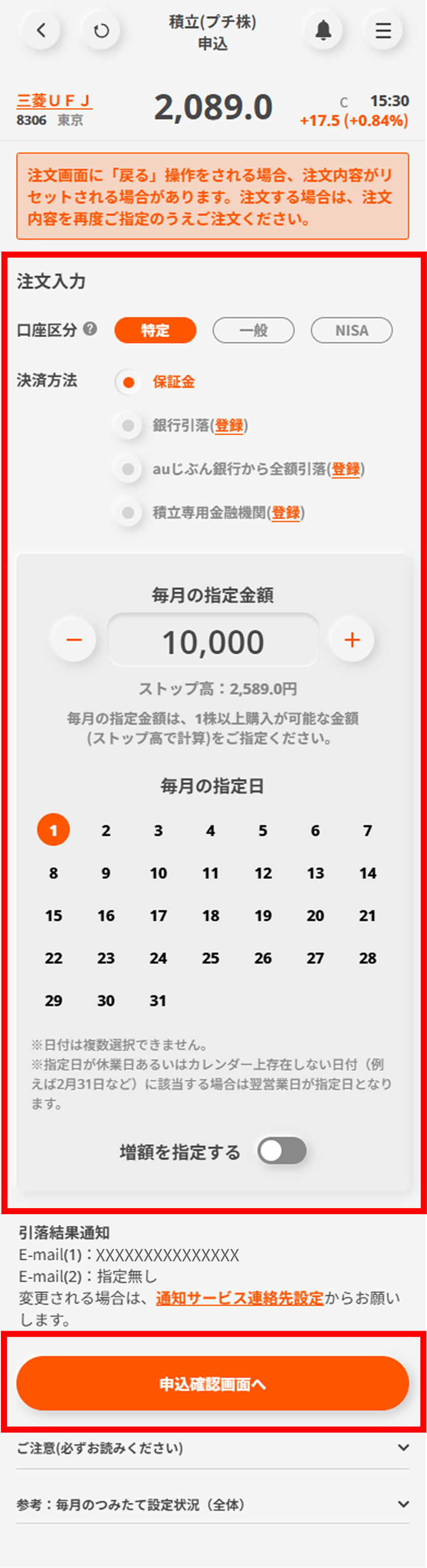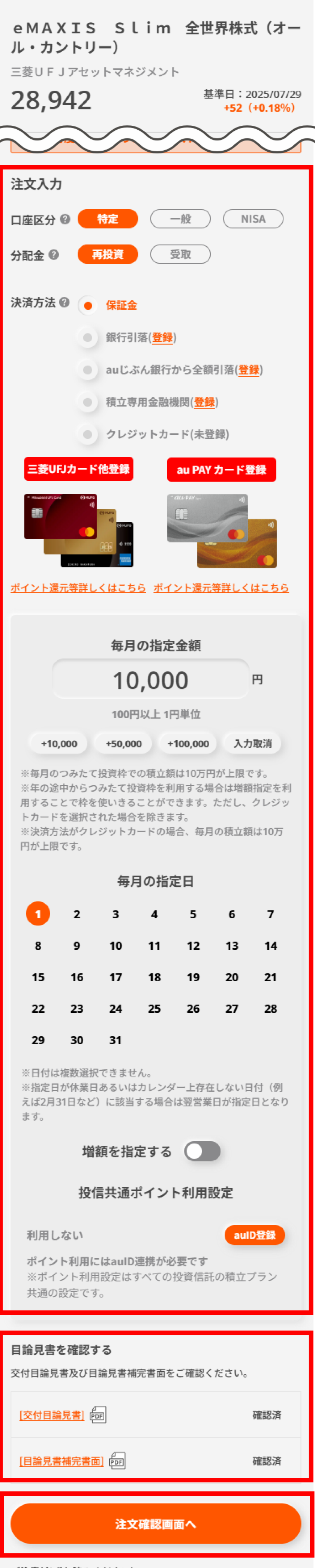 注文内容を入力し、目論見書を確認のうえ「注文確認画面へ」ボタンをタップする。