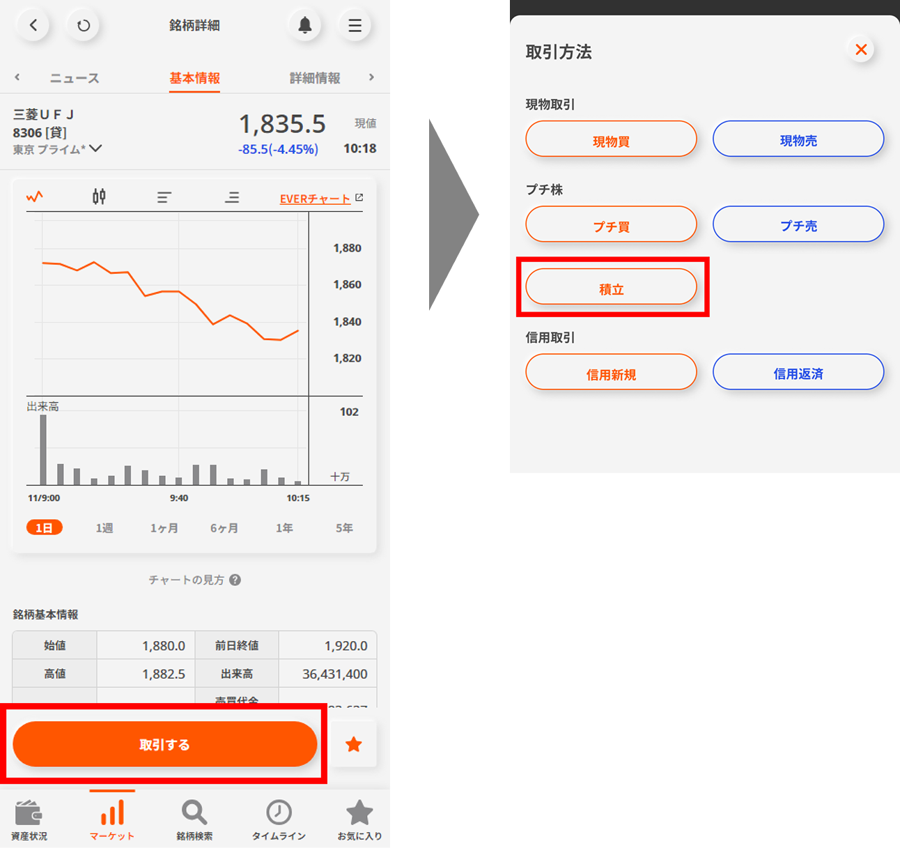 「積立」ボタンをタップする。