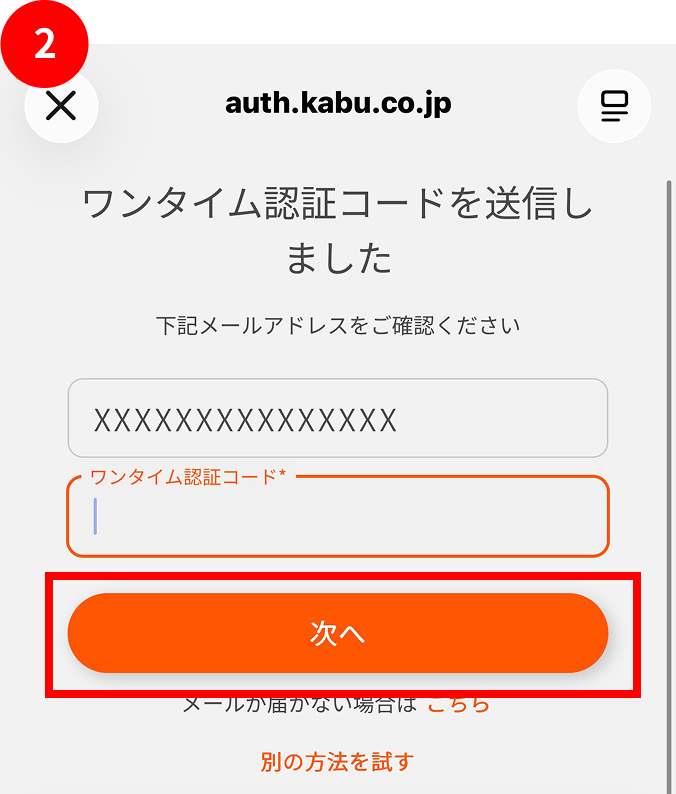 - 登録済みのメールアドレス宛てにワンタイムパスワード(数字6桁)が届くため、入力して「次へ」ボタンをタップします