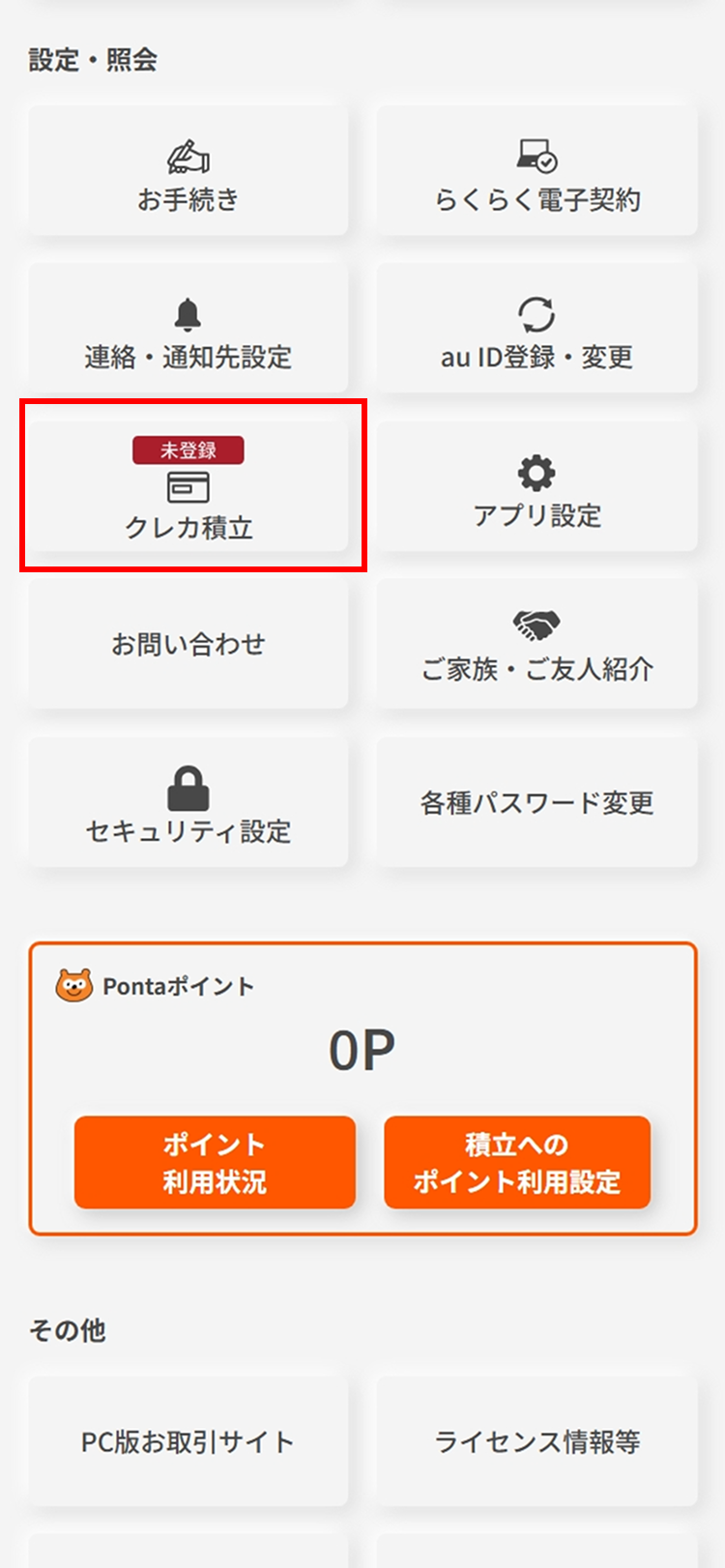 取引画面のメニュー[設定・照会]の[クレカ積立]を押してください。