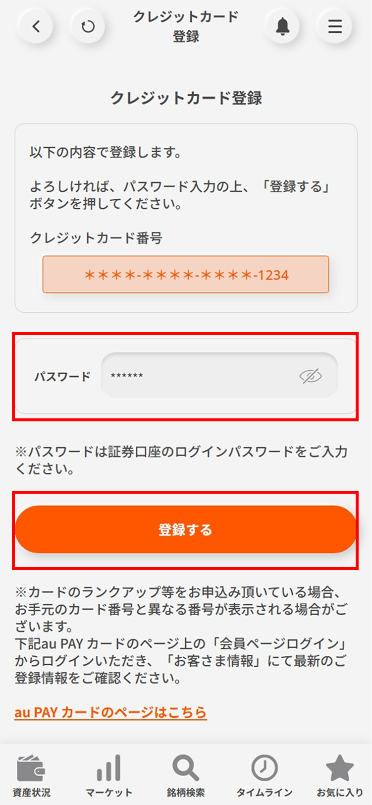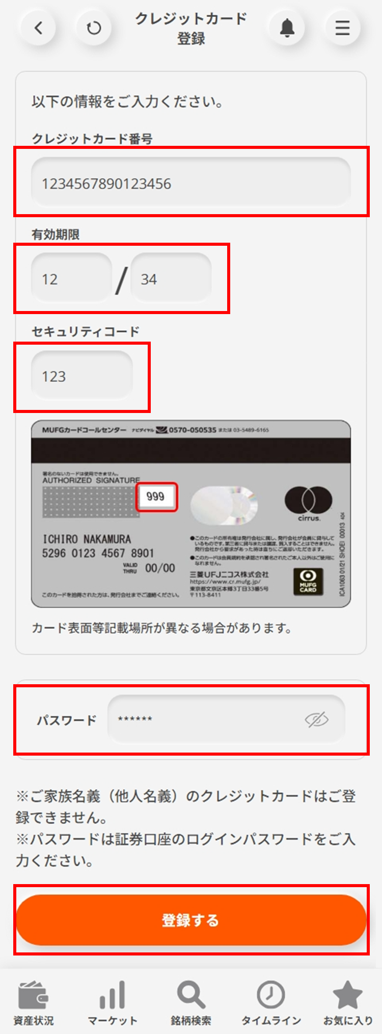 お客さまのクレジットカードの情報を入力後、証券口座のログインパスワードを入力し、[登録する]を押してください。