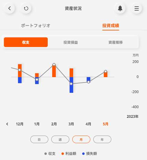 各投資商品の明細に記載の収支は[利益金額-損失金額]の合計額になります。