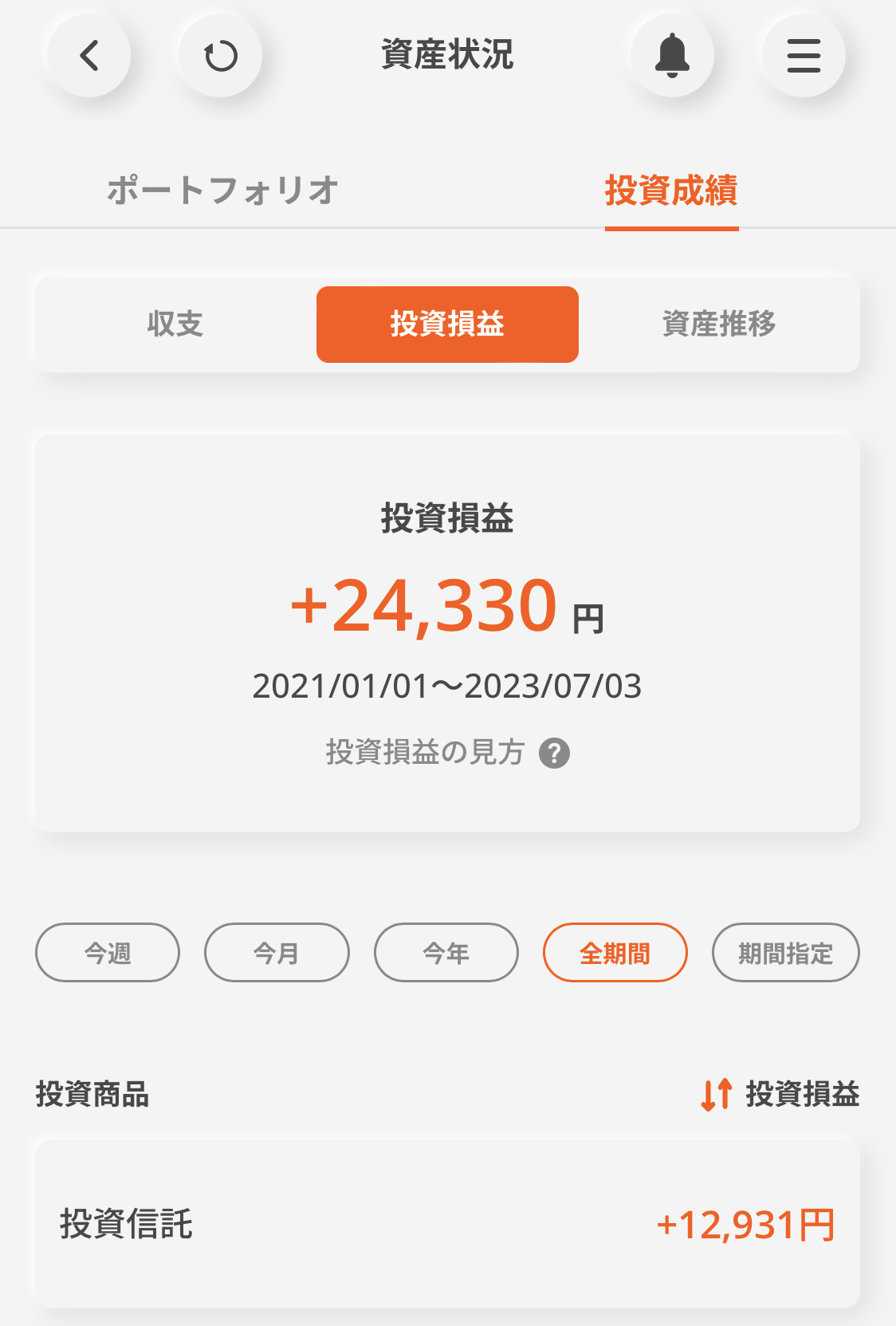 投資損益は全商品の[実現損益+評価損益]の合計額を表示しています。各投資商品の明細をタップ後、銘柄毎に合計した投資損益額が表示されます。