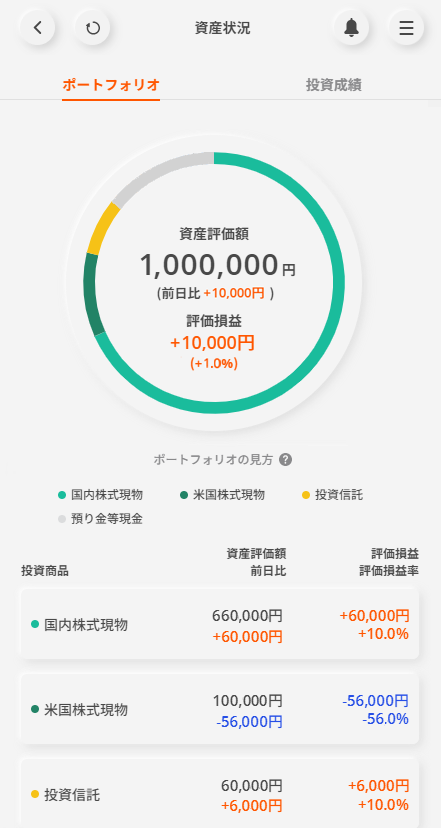 ポートフォリオ画面ではお客さまの現在の資産状況と、保有している投資商品の評価損益等の情報が表示されます。 ログイン後に素早く保有している投資商品のコンディションを確認することが可能です。対応している投資商品は「国内株式」「米国株式」「投資信託」「外貨建MMF」「先物」「オプション」「信用取引」になります。また、投資商品以外にも預り金等現金も表示がされます。上記以外の当社取り扱いの投資商品は順次拡充予定です。