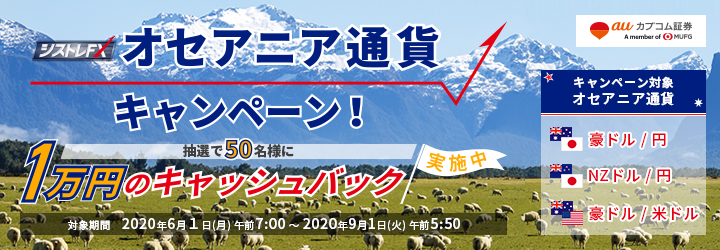 2020年6月1日(月)午前7:00~2020年9月1日(火)午前5:50の期間内に当社のシストレFX®のオセアニア通貨ペア【豪ドル/円(AUD/JPY)・NZドル/円(NZD/JPY)・豪ドル/米ドル(AUD/USD)】で一定のお取引をいただいたお客さまの中から、抽選で50名様に1万円をキャッシュバックいたします。 これを機に当社のシストレFX®オセアニア通貨のお取引をご活用ください!