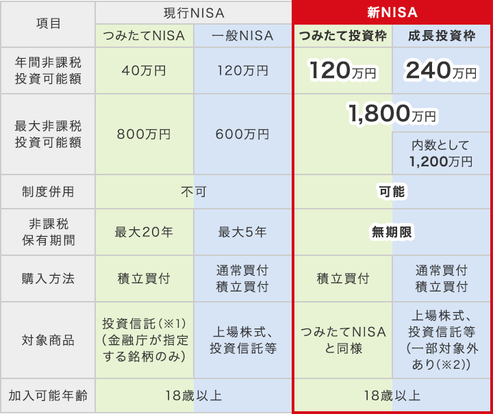 新NISAでは「つみたて投資枠」は年120万円となり現行のつみたてNISA枠の3倍、「成長投資枠」は年240万円となり現行の一般NISA枠の2倍となり、合わせて360万円と大幅に拡大されます。さらに枠の併用など使い勝手がよくなります。