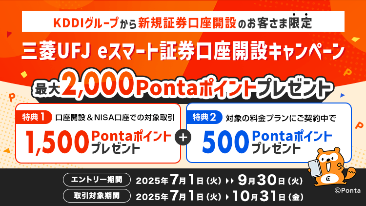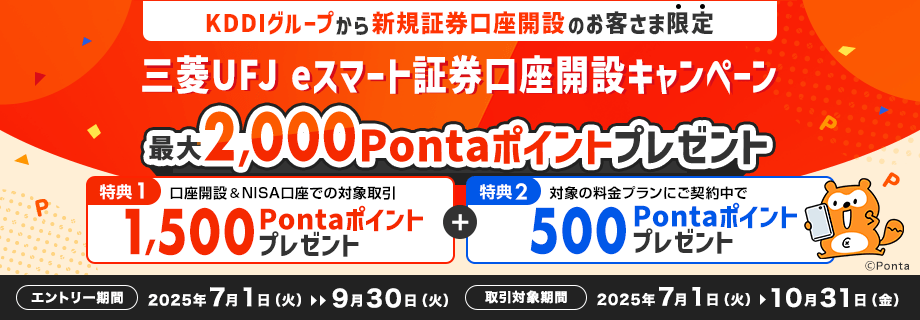 KDDIグループのウェブサイトやアプリから三菱UFJ eスマート証券口座申込&NISA口座で投信積立を行うとPontaポイントをプレゼントするキャンペーンを実施します。