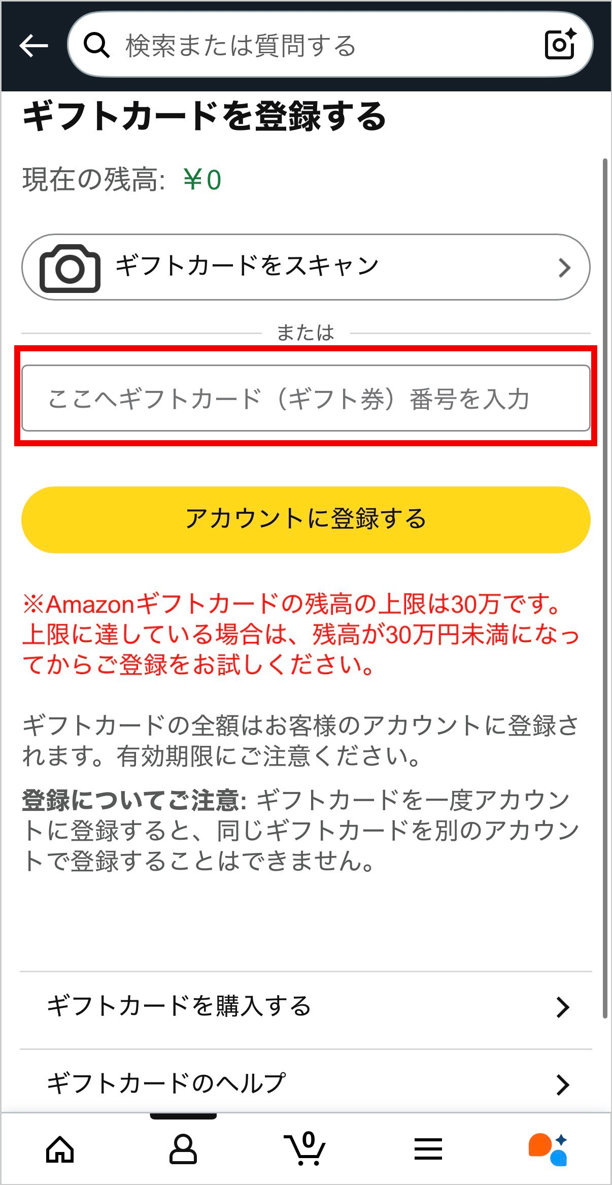 「アカウントサービス」から「Amazonギフトカードを登録する」を選択
