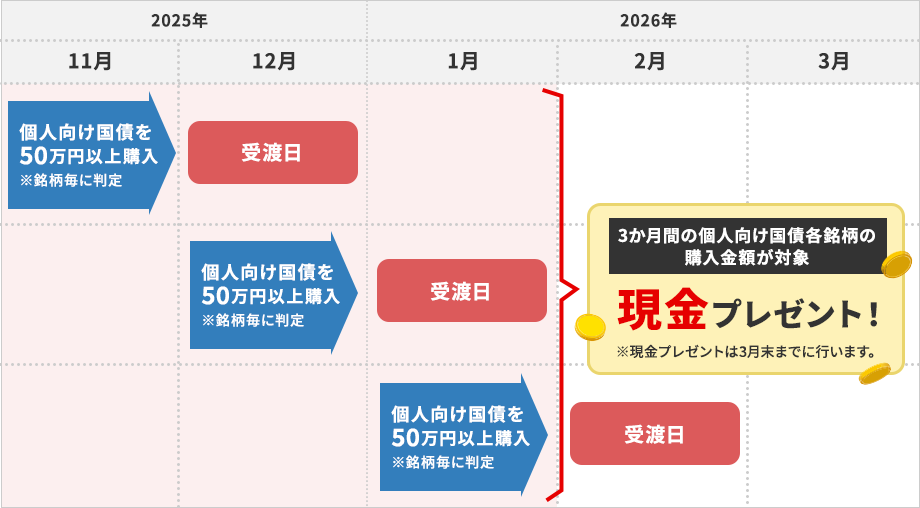 対象期間中に募集される個人向け国債を50万円以上ご購入されるとキャンペーン対象となります。