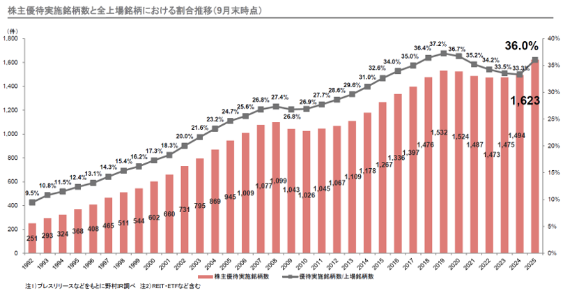 図2の通り、株主優待実施銘柄数は2025年9月末現在で1,623社まで増加し、過去最高社数を更新しています。また、上場企業全体に占める割合も36%となり、6年ぶりに増加しています。企業業績の回復だけではなく、2024年からの新NISAや東証の市場改革で上場維持基準を達成するため、また持ち合い株解消に伴う代替株主として個人投資家を意識した株主優待導入が増加したことなどが要因として挙げられます。