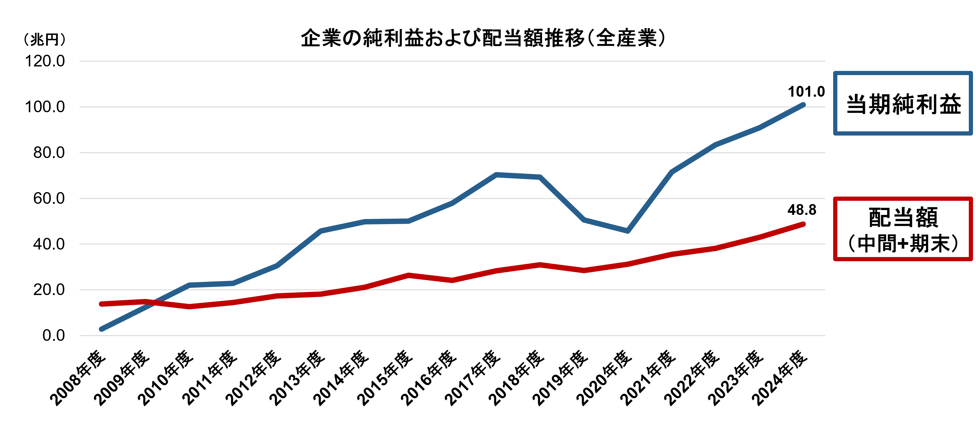 最後に配当です。法人企業統計調査のデータによると企業(全産業)の配当額は右肩上がりに上昇し、2024年度には48.8兆円と過去最高を更新しています(図4)。配当の原資となる純利益も過去最高を更新し、業績回復を背景に配当も増加していることが分かります。