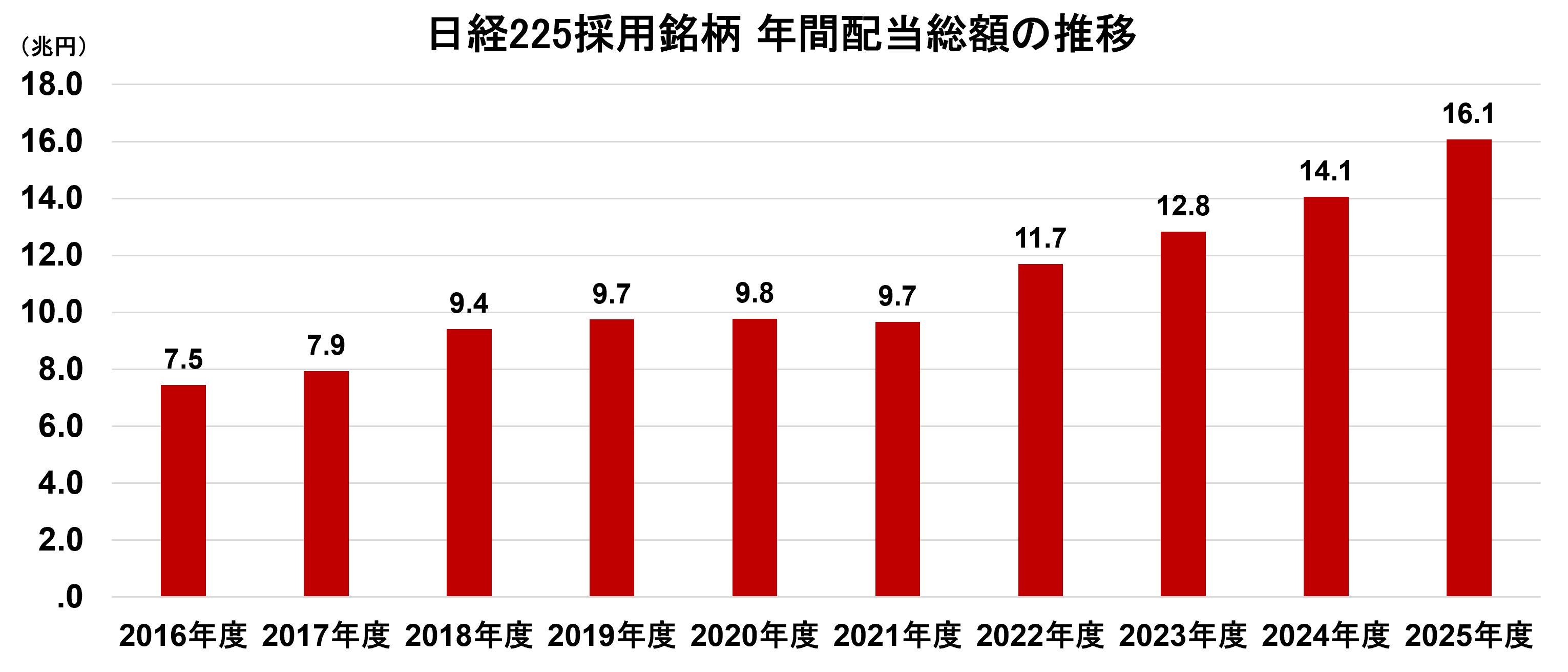 また図5の通り、日経平均採用銘柄に絞っても配当総額は直近で過去最高を更新しています。コロナ禍からの業績回復を背景に2022年度から着実に増加しており、2025年度は16兆円を超えています。