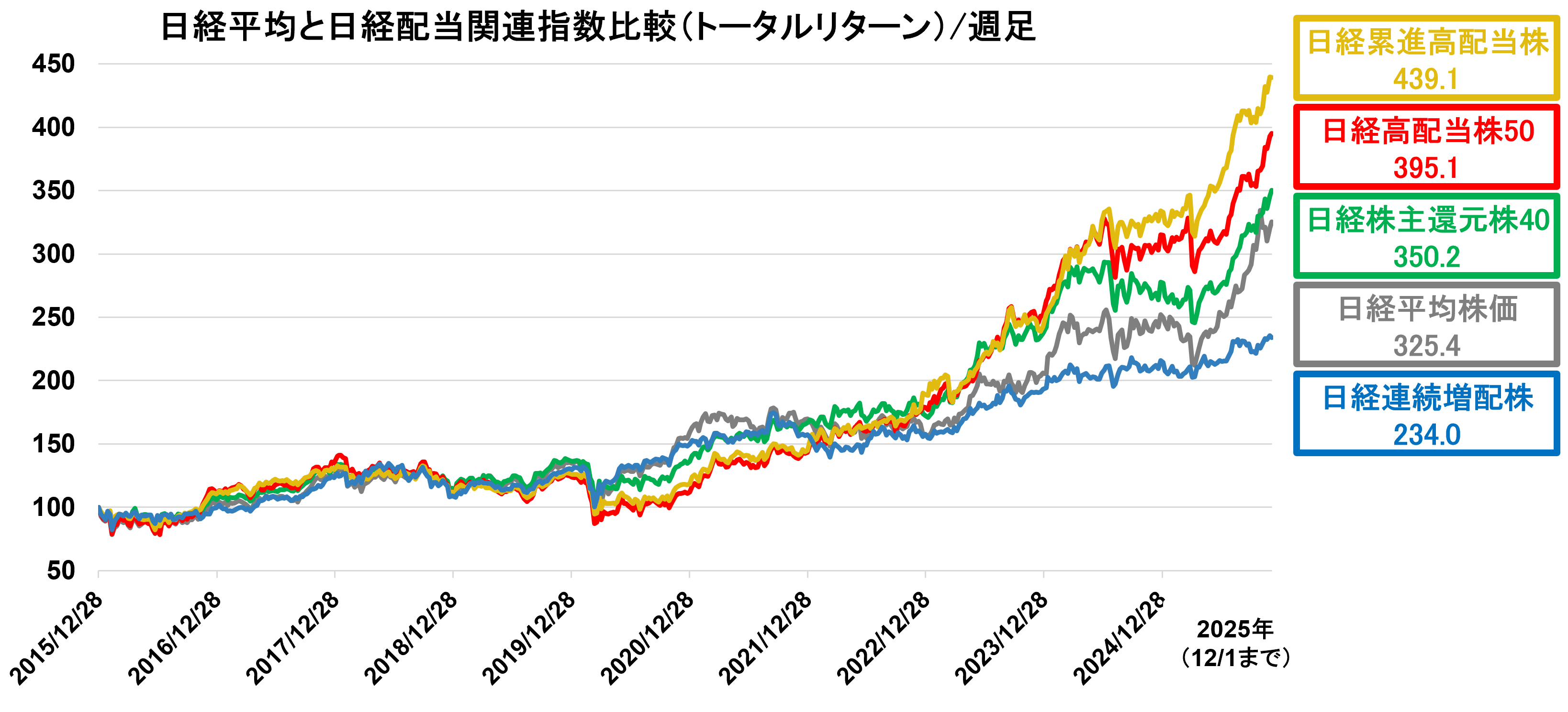 - 2015年末を100とする相対チャート(週足)、2025年は12/1まで、すべてトータルリターン(配当込み)指数