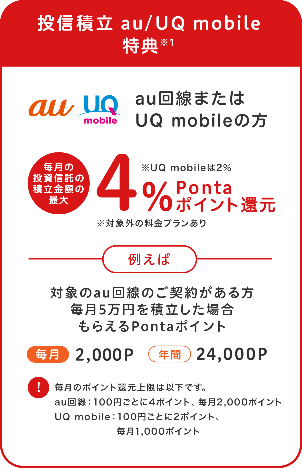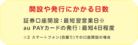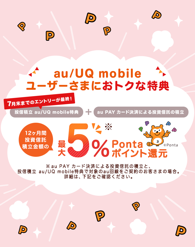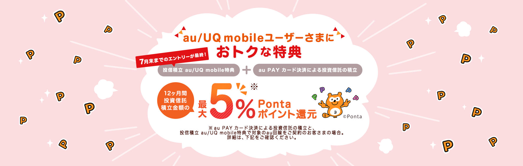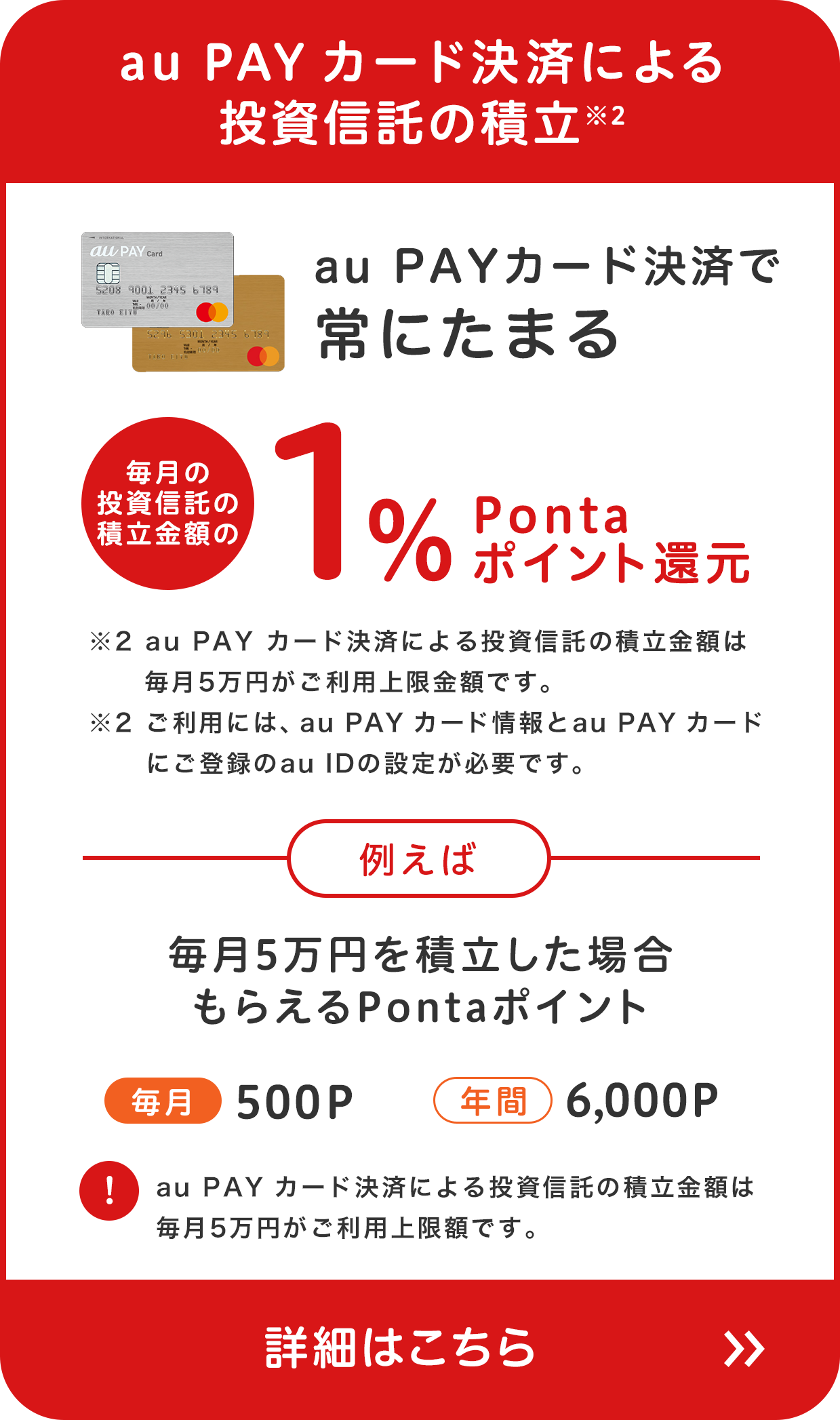 ※【au PAY カード決済の場合】:9月30日までの約定条件を満たすためには、事前にau PAY カードを証券口座へ登録完了の上で、8月5日(金)までに積立を設定する必要があります。au PAY カードの登録は、申込から完了までに1~2日営業日かかりますので、お早目にご対応ください。