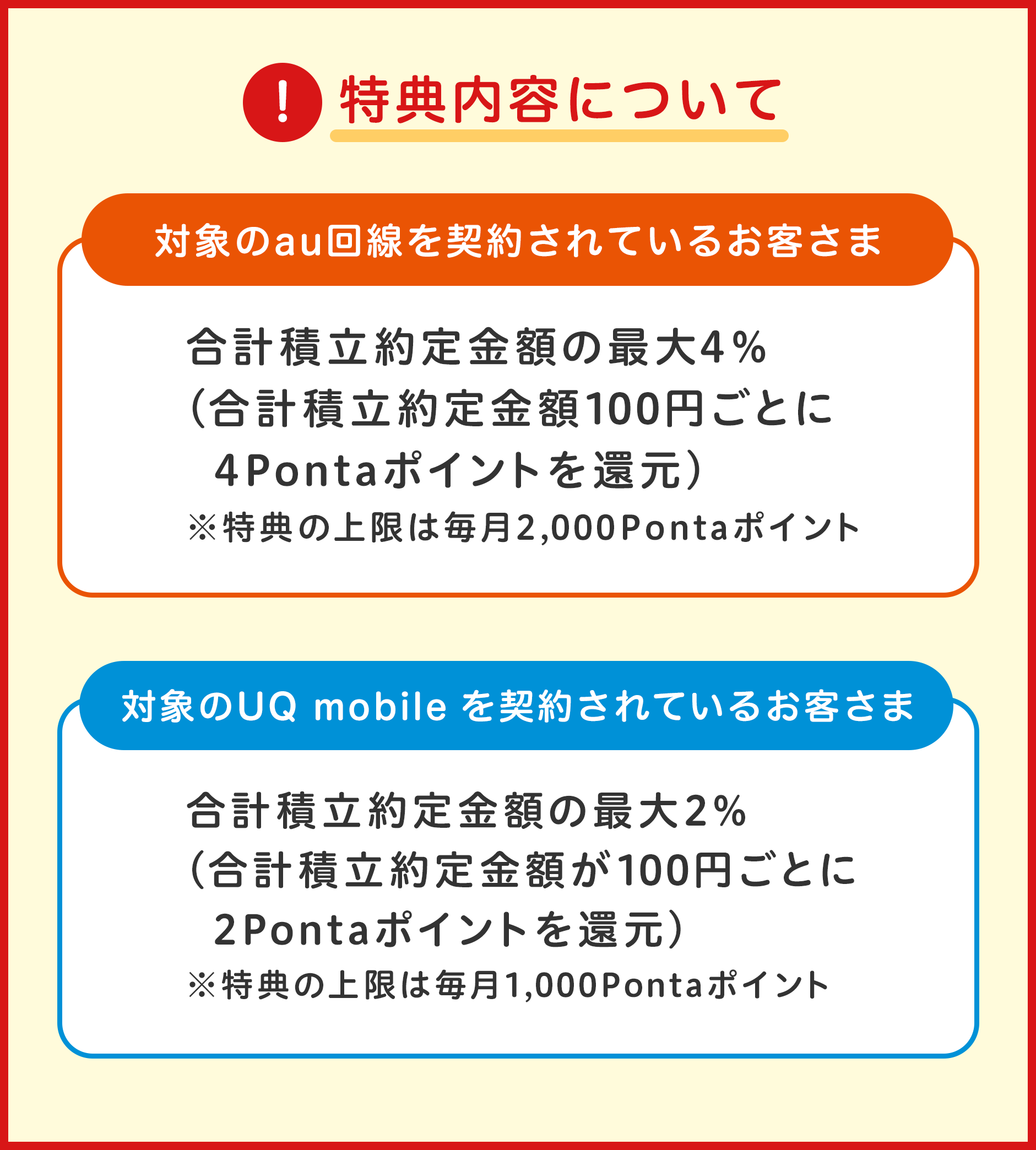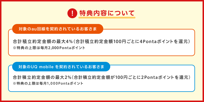 - ・三菱UFJ eスマート証券及びKDDIの利用規約に反する行為またはそのおそれがある場合など当社が不正と判断した場合は、特典対象外及び還元済Pontaポイントの失効等させていただく場合がございます。