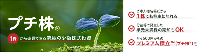 1株から売買することができるプチ株®(単元未満株取引)。100株や1,000株の上場株式の単元未満株でも1株から少額で売買できます!また、毎月500円以上1円単位の少額から「プチ株®(単元未満株取引)」を積み立てできるサービス「プレミアム積立®(プチ株®)」なら手数料無料! ※本ページでご案内している「資産形成デビュー応援キャンペーン」はプチ株®対象外です。