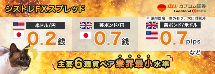 - (※6)提示スプレッドは固定されたものではありません。市場の急変時(震災などの天変地異、各国中央銀行の市場介入、その他外部要因)や、市場の流動性が低下している状況(米国東部時間午後5時前後、 年末年始、クリスマス時期など)、経済指標の発表前後などにより、スプレッドが拡大する可能性があります。また、変動が大きい相場になっている場合等は、スリッページが発生する可能性があります。スリッページとは、目視で確認できる価格とは相違する価格で約定する場合がありお客さまにとって不利なレートまたは有利なレートで約定することを総じた呼称です。原則固定・例外あり、大口(新規注文1回あたり110万通貨~ 300万通貨)対象外。広告スプレッド適用時間はAM9:00から翌日AM4:00となります。