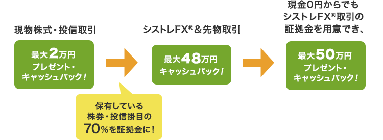 - (※2)取引対象期間中、国内株式・投資信託・シストレFX®・先物取引で最大50万円のプレゼント・キャッシュバックが可能です。