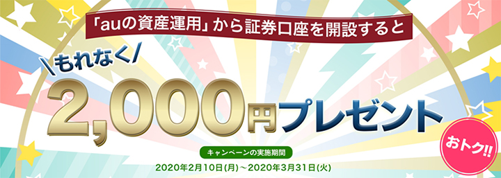 これを記念し、2020年2月10日から「auの資産運用」の専用ページから証券口座を開設するともれなく2,000円をプレゼントするキャンペーンを実施します。キャンペーンは、2019年12月25日以降に開設されたお客さまも対象となります。