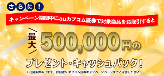 | 内容 | 対象期間中、「auの資産運用」ページおよびその他関連ページ経由にてauカブコム証券の証券口座を開設完了したお客さまにもれなく2,000円分の現金をプレゼントします。 詳細はこちら |