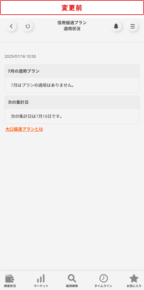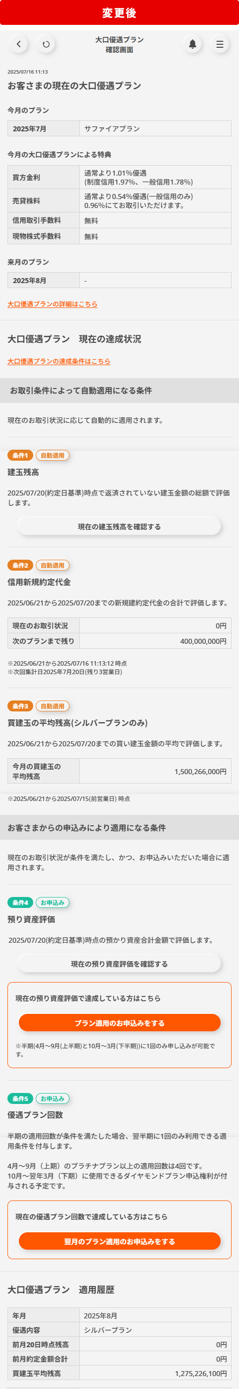2025年8月8日(金)より、スマートフォンサイト・三菱UFJ eスマート証券 アプリにおける「大口優遇プラン確認画面」の情報を拡充いたします。(予定)