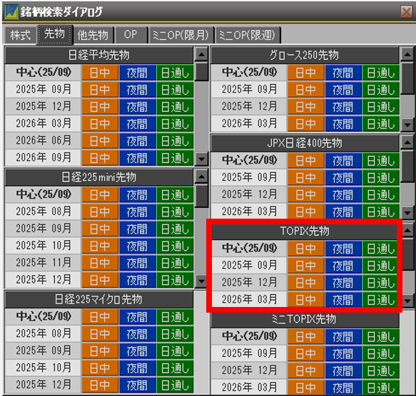 2025年5月26日(月)の日中立会より、「TOPIX先物」取扱限月の変更に伴い新たに追加された期先限月について、銘柄検索ダイアログ内へ表示されるようになりました。