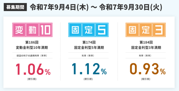 | 1 | 変動金利型10年満期「変動10」 | 実勢金利に応じて半年毎に適用利率が変わるため、実勢金利が上がれば受取利子が増えることもある。 | 10年 | 変動金利 | 半年毎に年2回 | 最低1万円から1万円単位 (額面金額100円につき100円) |