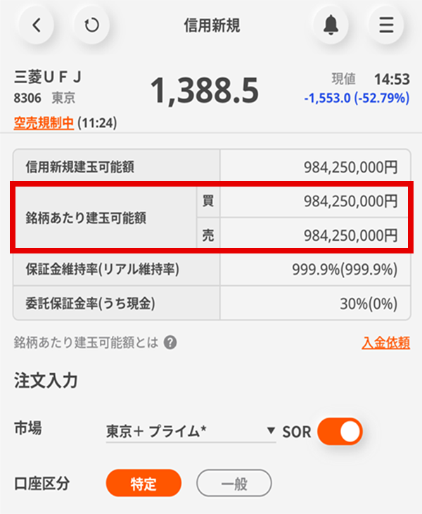 銘柄あたり建玉可能額は、個別銘柄ごとに信用取引の新規発注ができる上限額です。