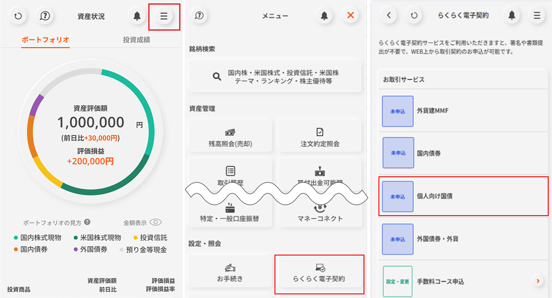 ログイン後ページ→「設定・申込」→「らくらく電子契約」→「個人向け国債」→「申込」