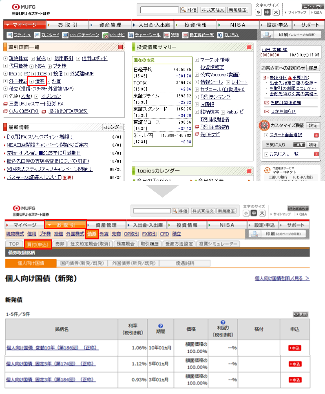マイページの「債券」からお取引ページの「TOP」か「買付(申込)」にある「個人向け国債」画面で取引を開始します。