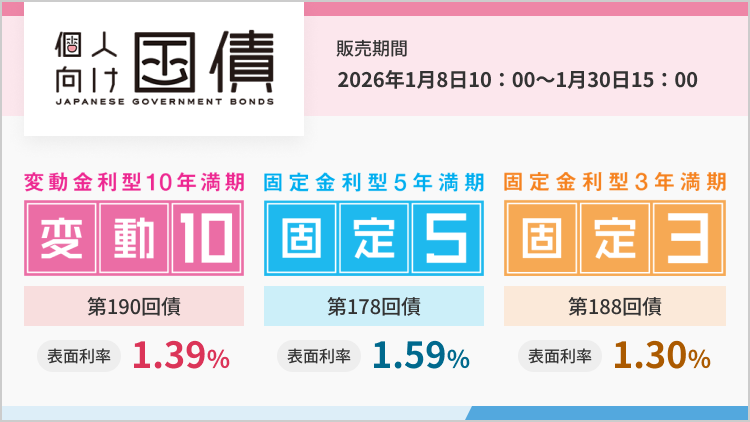 - 個人向け国債は、償還時や中途換金時に、発行体である日本国の信用状況等の悪化等により、投資元本を割り込み、損失が生じるおそれがあります。