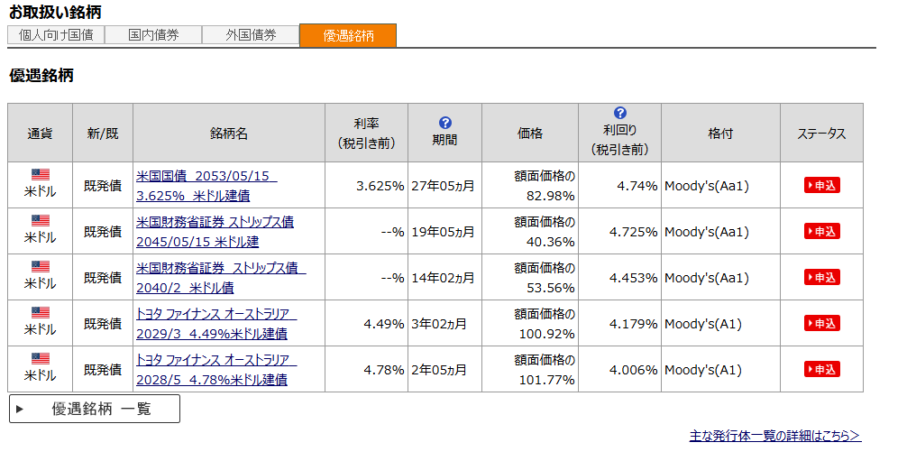 優遇銘柄はマイページ上の、債券取引のトップページ「優遇銘柄」よりご確認いただけます。