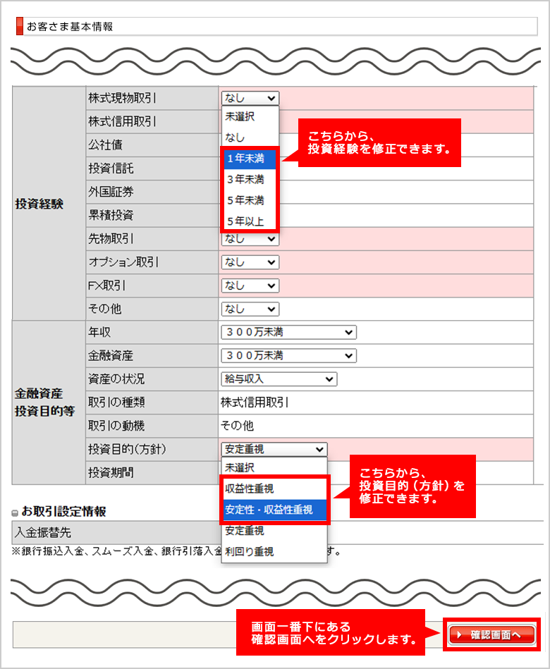 また、先物・オプション取引を始めるには、株式・信用・FX取引のいずれかで、お取引の経験(下図②)が必要になります。(他社でのお取引を含みます。)情報に更新がある場合は、お客さま基本情報を変更する(下図③)より、ご登録情報の更新が可能です。