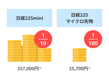 日経225miniや日経225マイクロ先物の1枚あたりの必要証拠金は、日経225先物と比べて、それぞれ10分の1、100分の1と少額です。