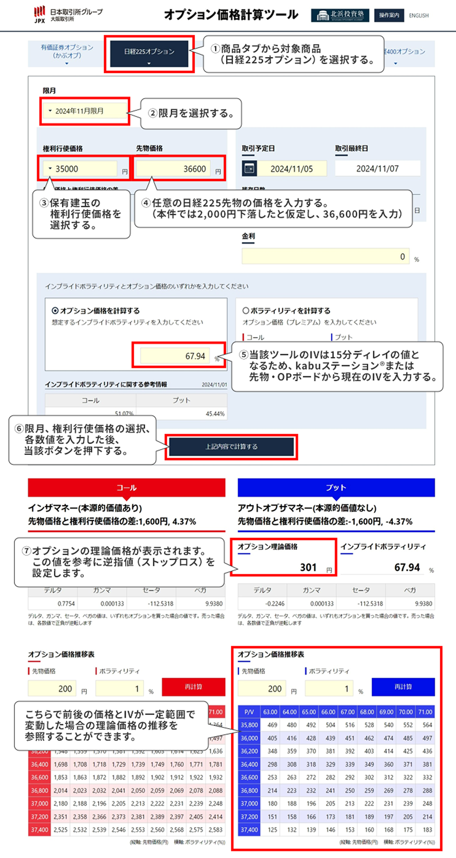 任意の日経平均(日経225先物)でオプションの理論価格を確認するには、日本取引所グループ/大阪取引所が提供する「オプション価格計算ツール」を活用する方法があります。